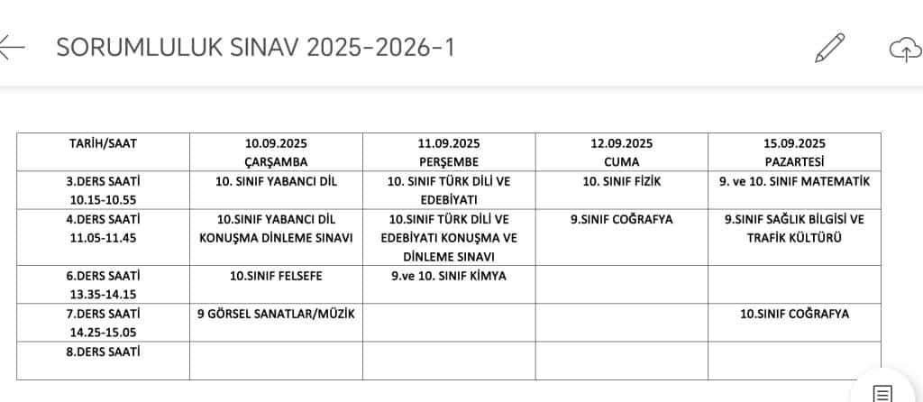 2025-2026 EĞİTİM ÖĞRETİM YILI EYLÜL DÖNEMİ SORUMLULUK SINAVLARI