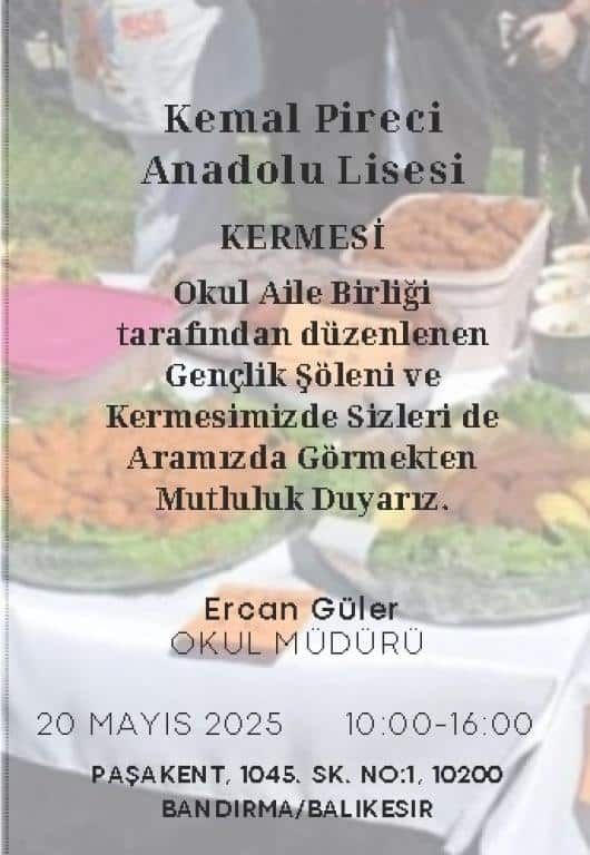 20 Mayıs 2025 Salı günü okulumuzda gerçekleştireceğimiz Kermes Etkinliğimize sizleri davet etmekten büyük mutluluk duyuyoruz. Öğrencilerimizin emeği, öğretmenlerimizin rehberliği ve siz değerli velilerimizin katkısıyla hazırlanan bu anlamlı günde; lezzetli yiyecekler, el emeği ürünler ve sürpriz etkinlikler sizleri bekliyor olacak.